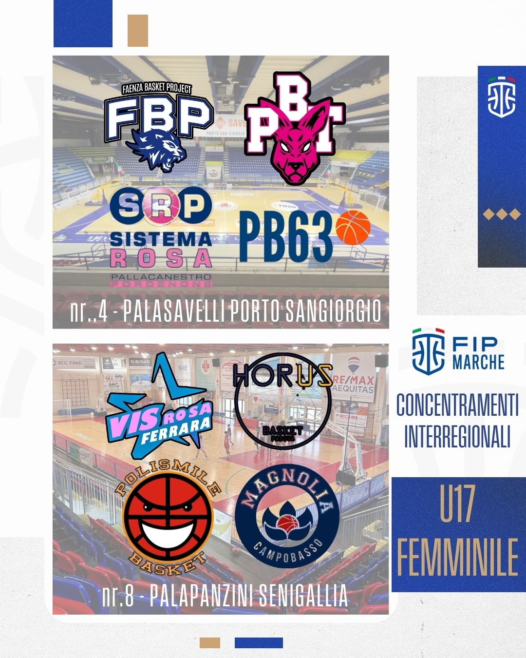 Nei concentramenti interregionali gioca anche la marchigiana Bartoli Mechanics Fossombrone, impegnata nel Concentramento nr.1 di Porretta Terme (BO) Le forsempronesi di coach Luigi Gresta avranno come avversarie il Basket Costa (1a della Lombardia), Roma Team Up (2a del Lazio) e Futurosa Forna Bk Trieste vincente nello spareggio contro la Cestistica Rivana (vinto 50-81 a Riva del Garda e bis in casa 73-61). La Bartoli Mechanics Fossombrone, prima nel campionato umbro-marchigiano gestito dall’CR FIP UMBRIA, esordirà venerdi 10 aprile alle ore 16.00 contro Costa Basket. Nel team U17 lombardo giocano Ginevra Pini ed Irene Radice, atlete 2010 chiamate nel raduno più recente della Nazionale U16. La prima ha giocato con l’Italia U15 il Trofeo dell’Amicizia 2024.